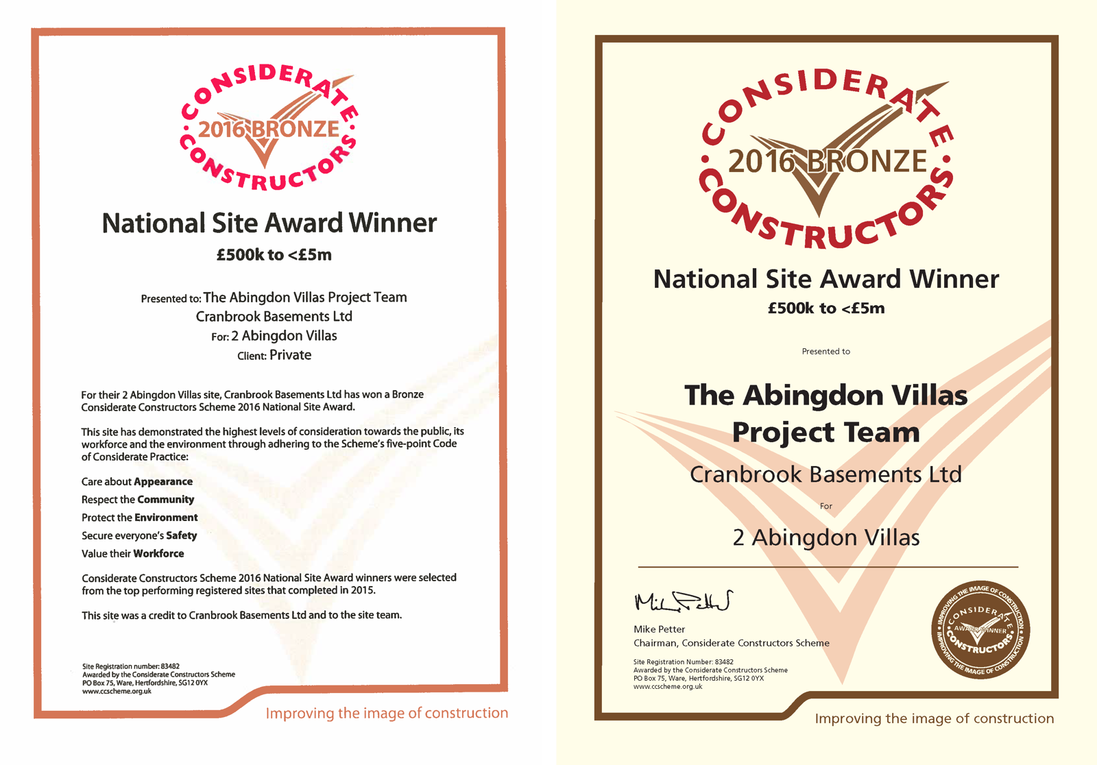Winners of more Considerate Constructors Awards than any other basement company, the Cranbrook team sets the gold standard for Considerate Construction. Awarded the highest national Gold Standard by the independent assessment panel at the Government endorsed Considerate Constructors Organisation, Cranbrook sets the benchmark for the basement development and prime residential construction sectors.