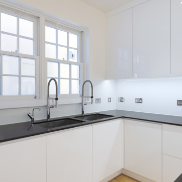 The basement level accommodation was intended to provide both the kitchen and library area which required significant levels of natural daylight. This was achieved by the introduction of both light wells and structural glass floor plates located below a new glazed conservatory extension.