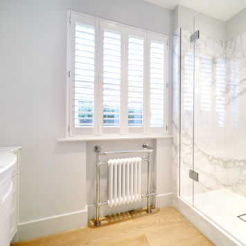 With space at a premium the ensuite bathroom was carefully designed to fit directly below the basement access their flight. The clever use of a marble finish around to the bath provides a generous bathing area with useful storage.